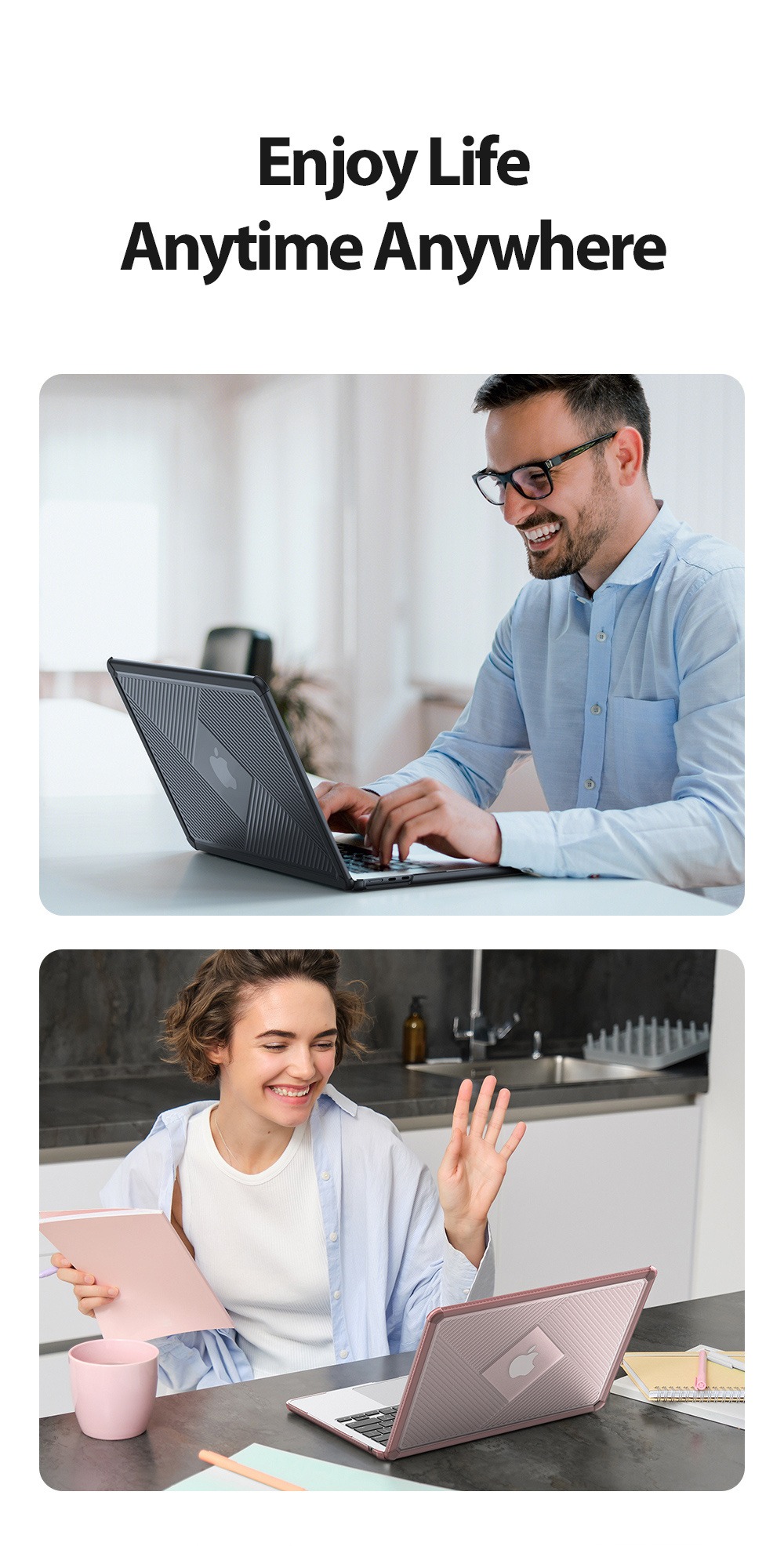 Its TPU bumper shell and PC center provide robust shock absorption for drops and hits. Designed for MacBook Pro and MacBook Air users, this case supports heavy use, travel, and long work hours.