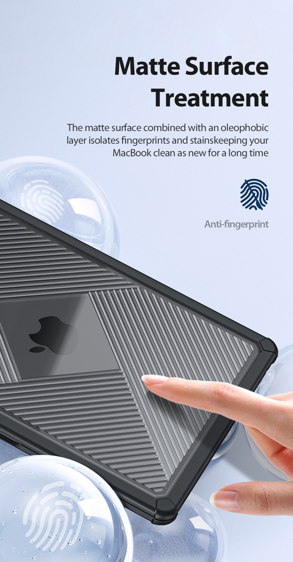 Whether you’re working from home or traveling, this case keeps your MacBook safe from cracks, scratches, and daily damage. The matte surface with an oleophobic layer resists fingerprints and stains, and the precision vents support proper heat dissipation—ensuring your MacBook stays cool and clean.