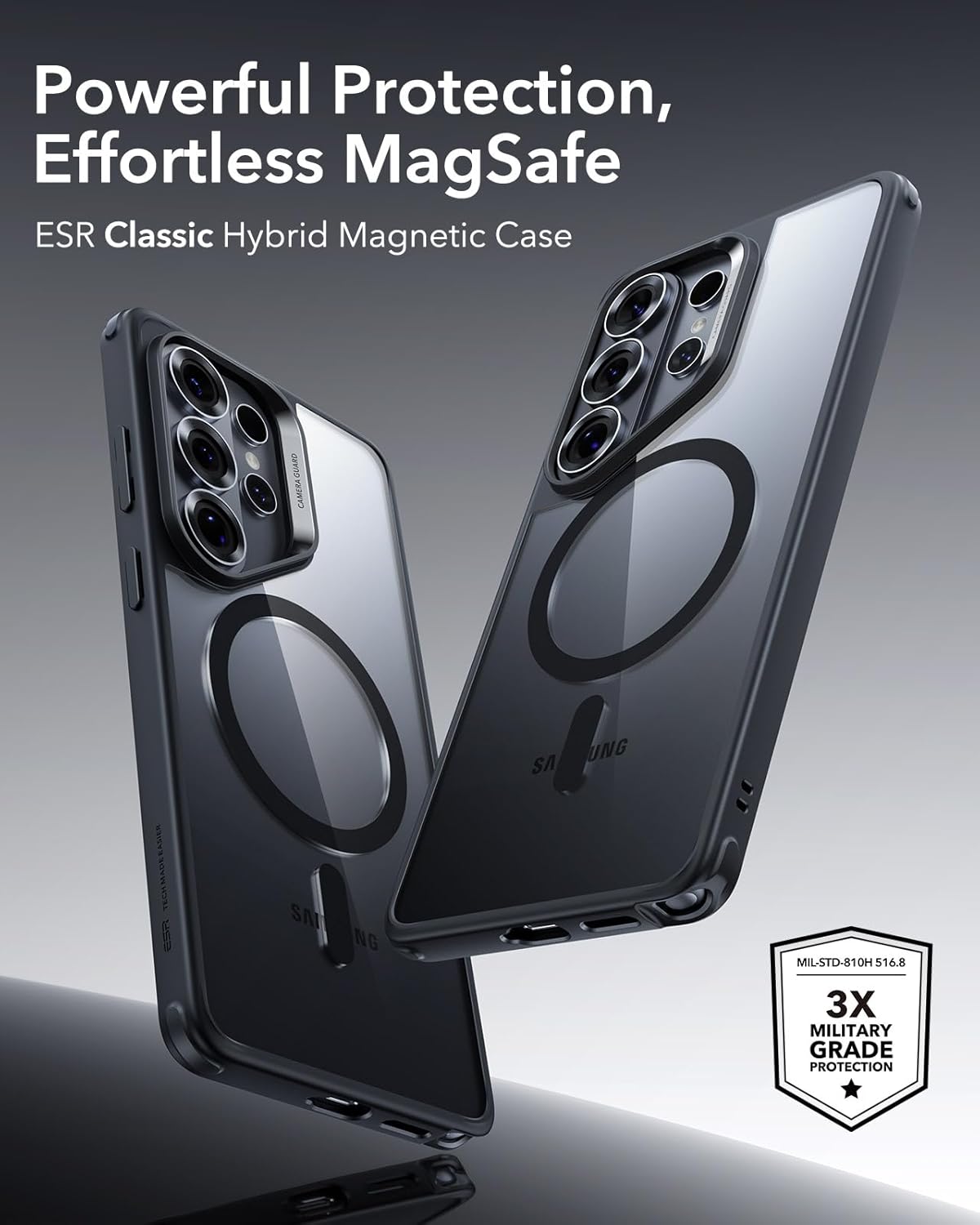 Premium ESR Classic Hybrid magnetic case for Samsung Galaxy S26 Ultra with military-grade protection, MagSafe compatibility, and anti-yellowing clarity.