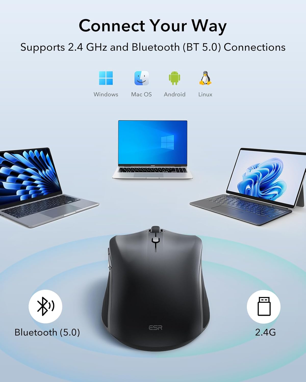 Dual Connectivity: Switch between Bluetooth 5.0 and 2.4 GHz wireless for maximum compatibility.