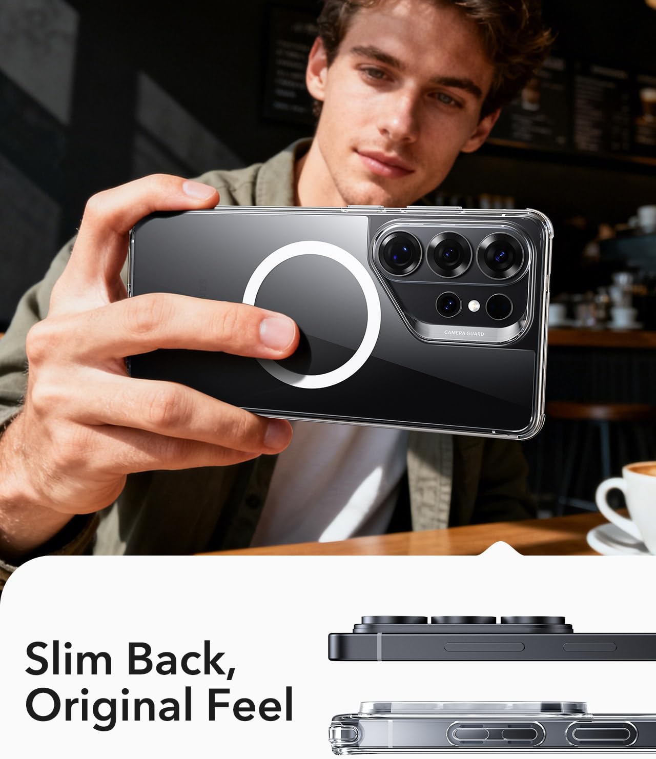 The ESR Samsung S26 Ultra case protects your Galaxy S26 Ultra while keeping its original design visible. Built with reinforced hybrid materials, it delivers military-grade drop protection, powerful magnetic alignment, and a crystal-clear anti-yellowing back.