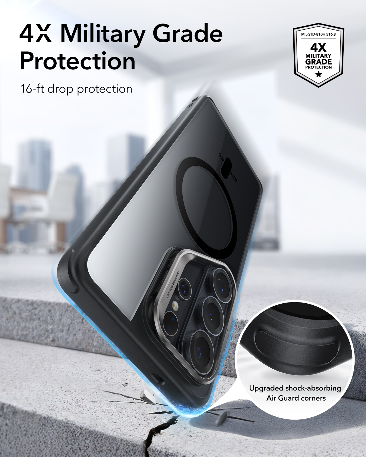The ESR Classic Hybrid Stash Stand case is built to protect your device while adding everyday convenience. It combines military-grade drop protection, strong MagSafe-compatible magnets, and a discreet metal stash stand integrated into the camera frame.