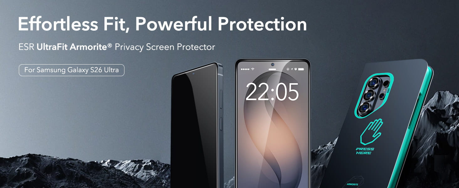 Protect your Samsung Galaxy S26 Ultra with enhanced durability and complete on-screen privacy using the ESR UltraFit Armorite® Privacy Screen Protector.