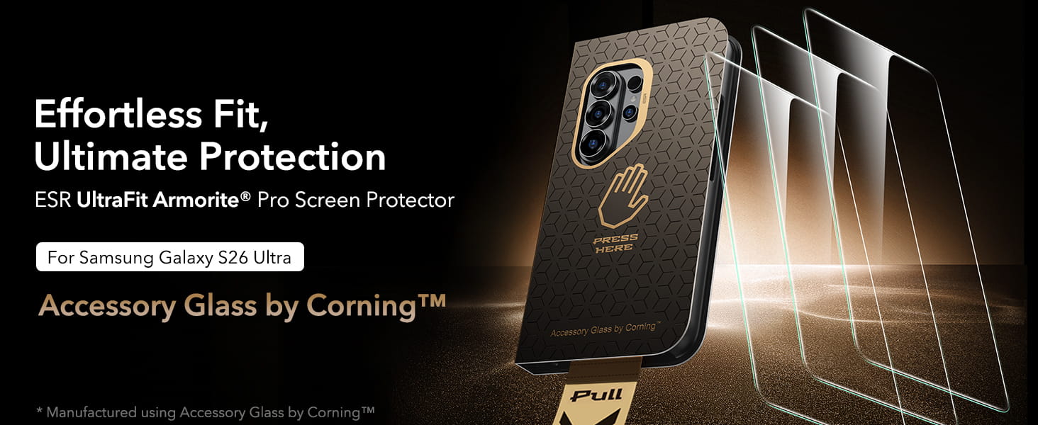 Give your Samsung S26 Ultra the highest level of display protection with the ESR UltraFit Armorite Pro Screen Protector, engineered using Accessory Glass by Corning™ for superior durability and crystal-clear visuals.