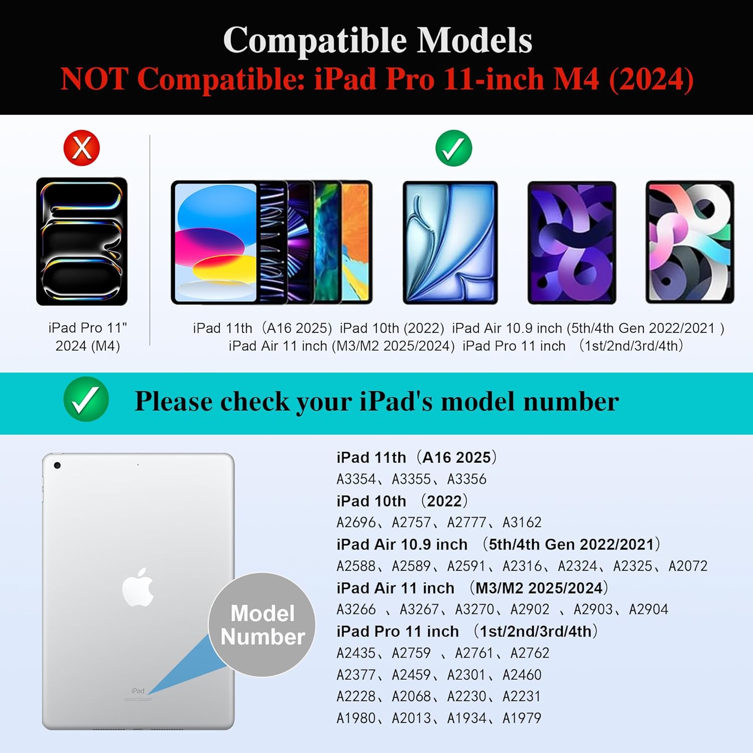 The case supports iPad 11th Gen A16/10th Gen, iPad Air 11" M2/M3, iPad Pro 11" (1st–4th Gen), and iPad Air 4/5 (10.9"). Always check your iPad model number before purchase.