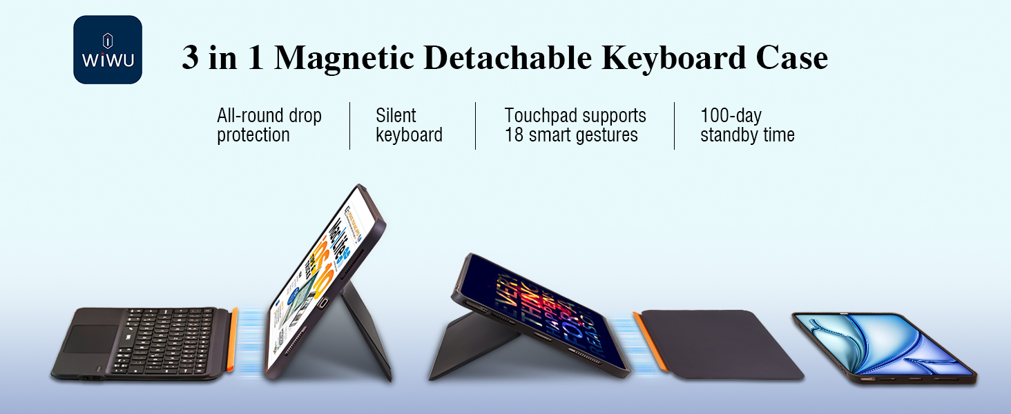 The WiWU MK-005 can be used as a protective case, a detachable keyboard, or an adjustable stand. Strong magnets secure the iPad, allowing easy transitions between typing, viewing, and protection modes.